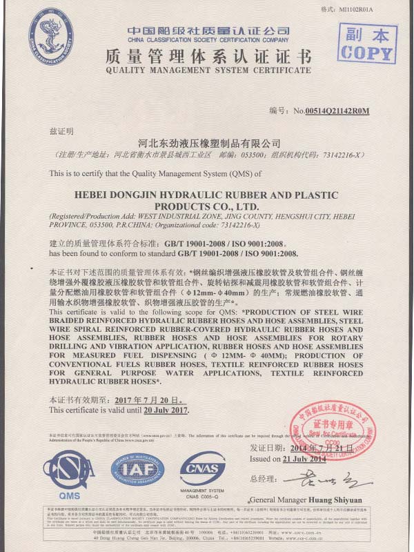 • 鋼絲編織管采用國際標準認可認可證書